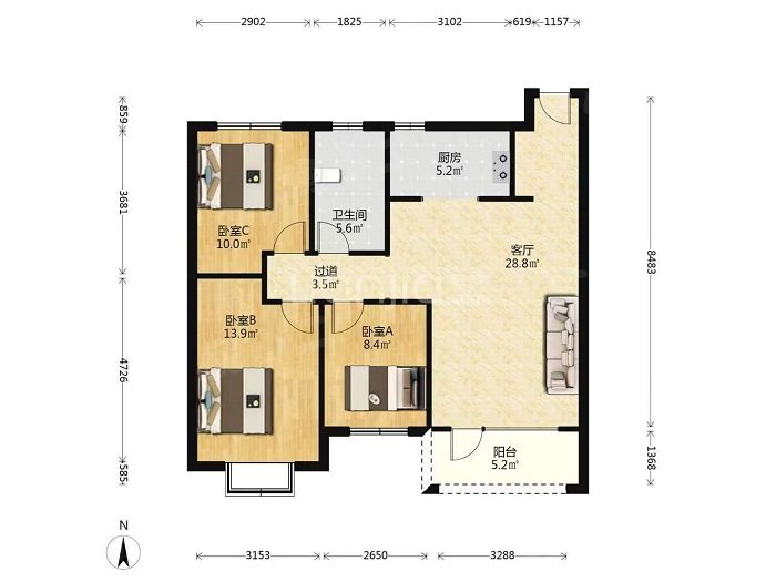3室2厅1卫,115m²,88.5万